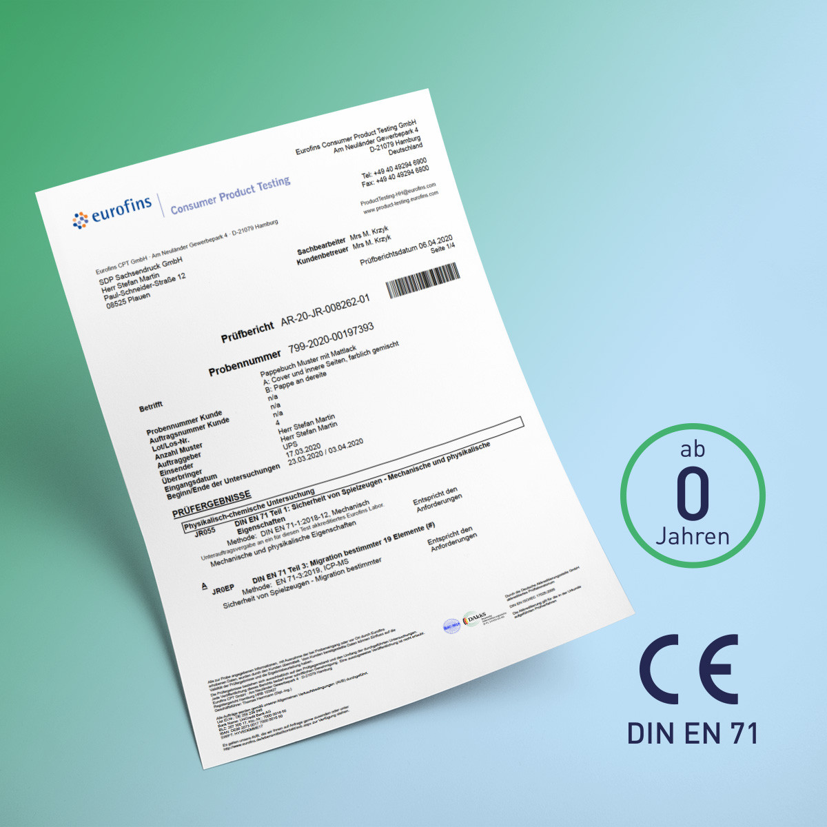 Ein von der Deutschen Akkreditierungsstelle GmbH zugelassenes Prüflaboratorium in Hamburg hat unser pappzarapp-Buch analysiert und bestätigt, dass das Produkt den Anforderungen der Spielzeugnorm entspricht. Den Prüfbericht kannst Du hier einsehen: